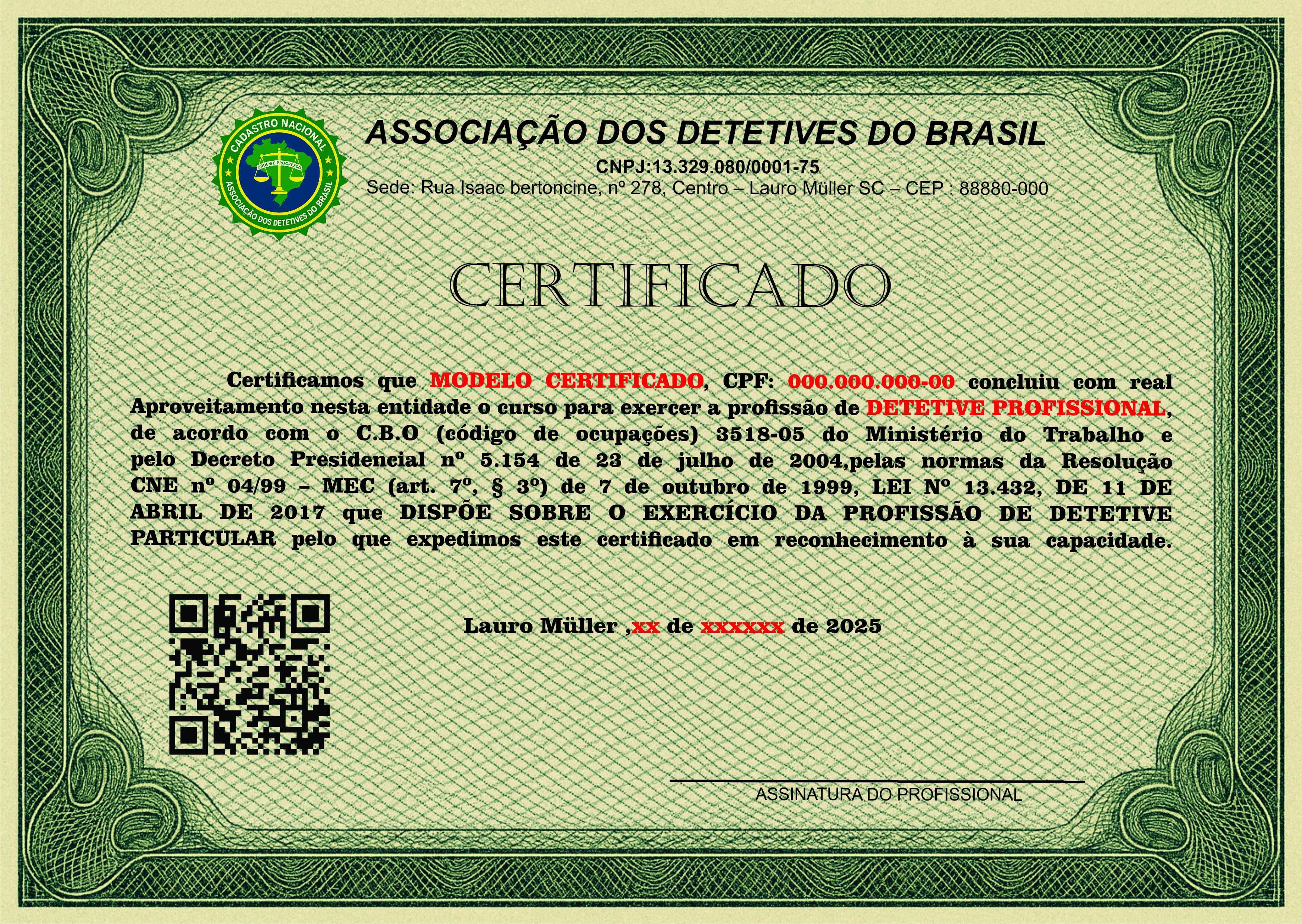 – Certificado de formação atestado pela Associação dos Detetives do Brasil (ADB)